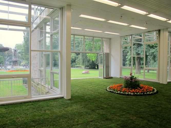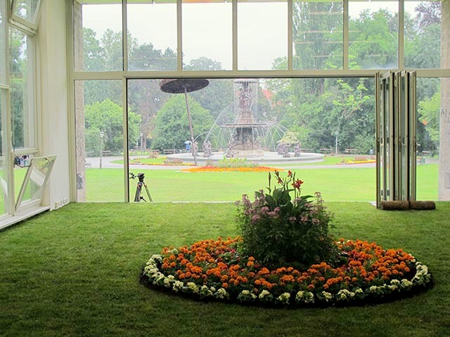 Im Rahmen des Projektes „Zimmer mit Ausgangslage“, das das Forum Stadtpark Graz aufgrund der Initiative des Künstlerinnenduos RESANITA 2014 realisierte, reagierten die beiden Künstlerinnen mit einem radikalen Eingriff in den Ausstellungsraum, der diesen erweitere, offenlegte aber gleichzeitig auch verschwinden ließ. Das Forum als solitäres Gebäude mit seiner, durch eine Glaswand einsehbare Ausstellungsfläche wurde für einige Tage zu einem Teil der es umgebenden Gartenarchitektur und in seiner Rolle als Akteur mit jener des Stadtparks kurzgeschlossen. Die Künstlerinnen öffneten die Glaswand um den Umraum des Parks in das Innere des Hauses zu holen. Diese künstlerische Strategie erweitere die pflanzliche Vegetation des Stadtparks um 170 m² und reflektierte die Bestrebungen der Stadt Graz, eine Sanierung des Umfelds rund um den Franz-Josef Brunnen im Grazer Stadt-park neu zu überdenken. Ein Blumenbeet inmitten des Ausstellungsraumes glich sich an die Architektur des Außenraumes an, indem ein Rollrasen aufgelegt wurde, in dessen Mitte ein der Form des Brunnens entsprechender Kreis aus Zinnien, Wachsbegonien und Tagetes gepflanzt wurde. Die Künstlerinnen bezogen sich hier auf historische Gartenkunstentwürfe, die auf die geografische Längsachse zwischen der Zinzendorfgasse, dem Brunnen und dem Forum rekurrieren.
